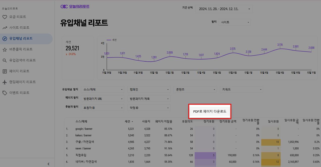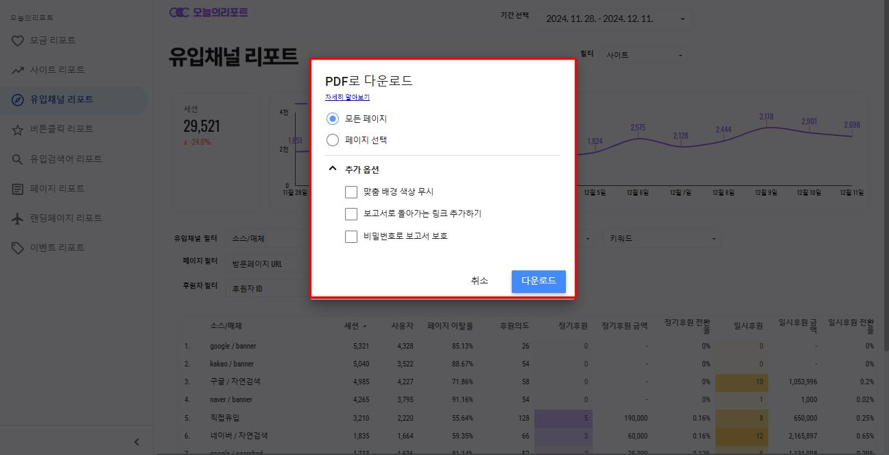 오늘의리포트를 PDF로 다운로드 받을 수 있습니다.대시보드에서 우클릭해줍니다.PDF로 페이지 다운로드 버튼을 클릭합니다.옵션을 선택 후 [다운로드]버튼을 클릭합니다.페이지가 PDF로 다운로드 됩니다.