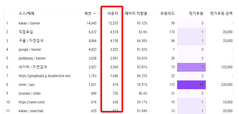 [유입채널 리포트]와 [사이트 리포트]에 사용자 지표가 추가되었어요. 이제 유입경로별로 사용자 수를 확인할 수 있어요.
