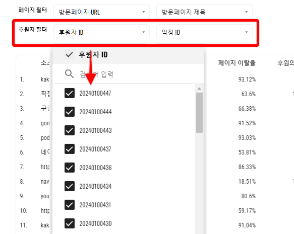 [유입채널 리포트]와 [버튼클릭 리포트]에 새로운 필터가 추가됐어요. 내부 CRM(후원자 관리 시스템)과 연동된 후원자 ID 또는 약정 ID 검색하여 특정 후원자의 유입채널을 확인하거나, 반대로 특정 유입채널에서 발생한 후원자의 명단을 추출할 수 있어요.